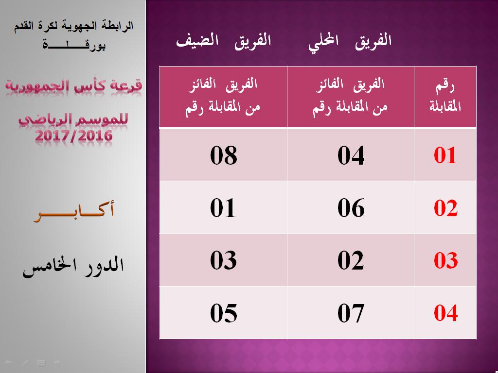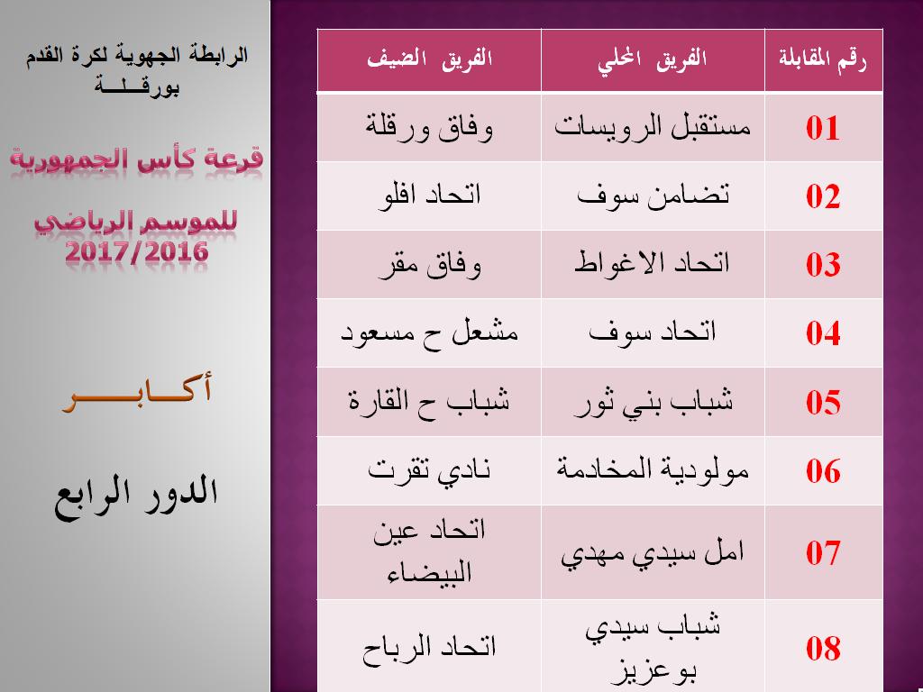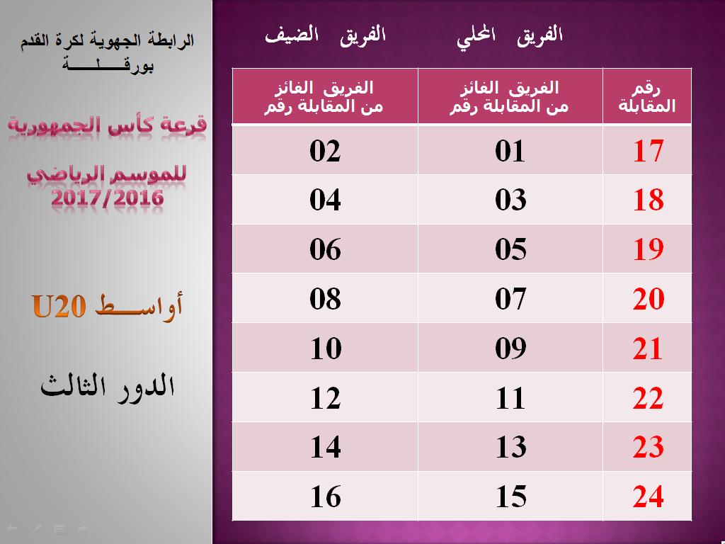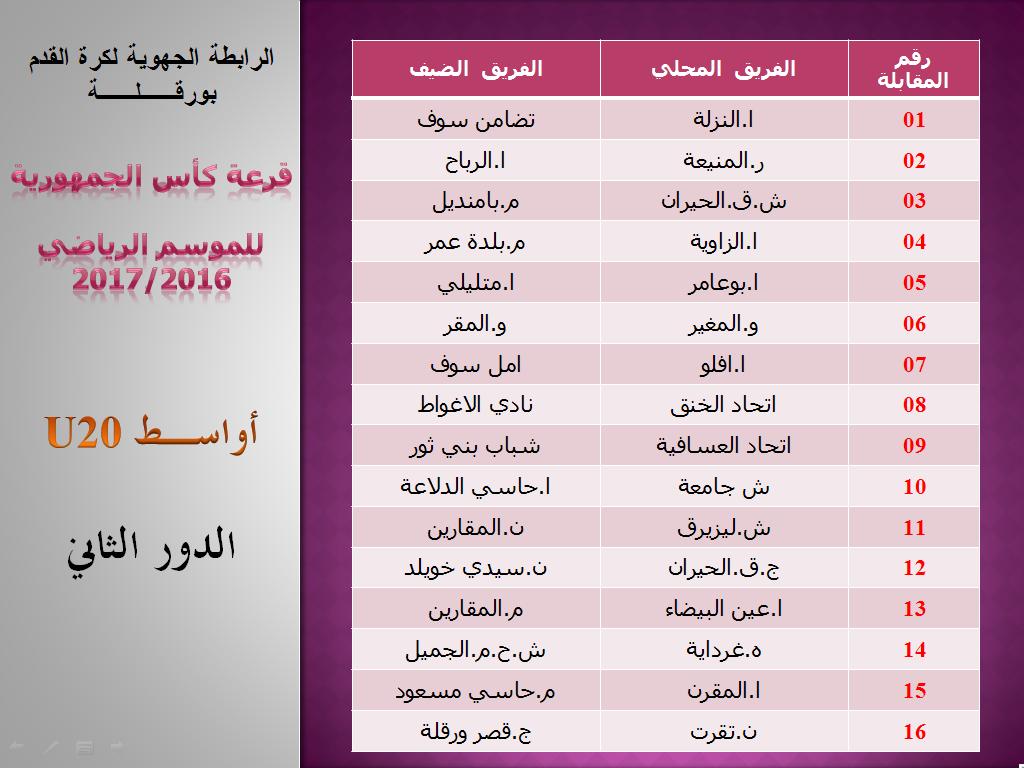 في يوم الخميس 20 أكتوبر 2016 تم بمقر الرابطة إجراء عملية قرعة تصفيات كأس الجمهورية للدور الرابع لصنف الأكابر و الدور الثاني والثالث لصنف الأواسط ، بحضور ممثلي الفرق المعنية