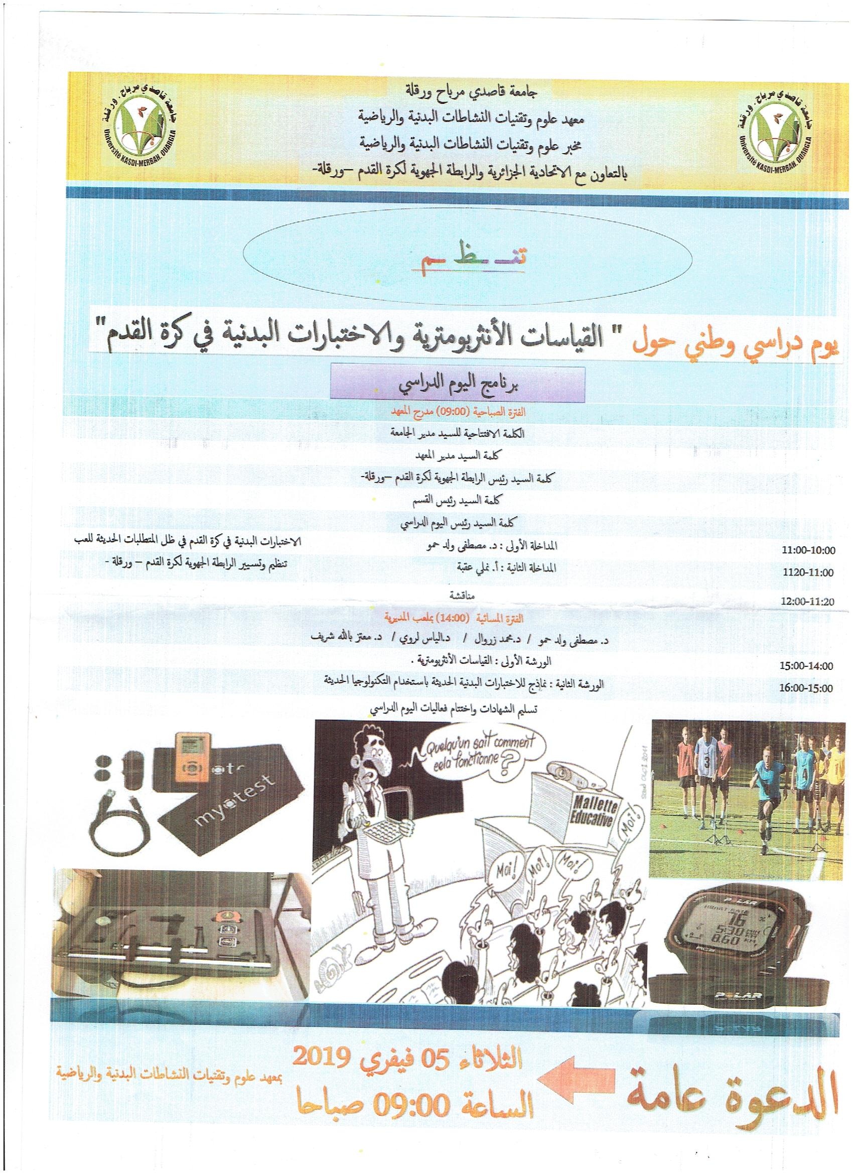 في إطار تنظيم اليوم الدراسي الوطني تحت عنوان "القياسات الأنثربومترية والاختبارات البدنية في كرة القدم" وذلك يوم الثلاثاء 05 فيفري 2019 ابتداء من الساعة 09:00 بمعهد علوم وتقنيات النشاطات البدنية والرياضية بجامعة قاصدي مرباح ورقلة.