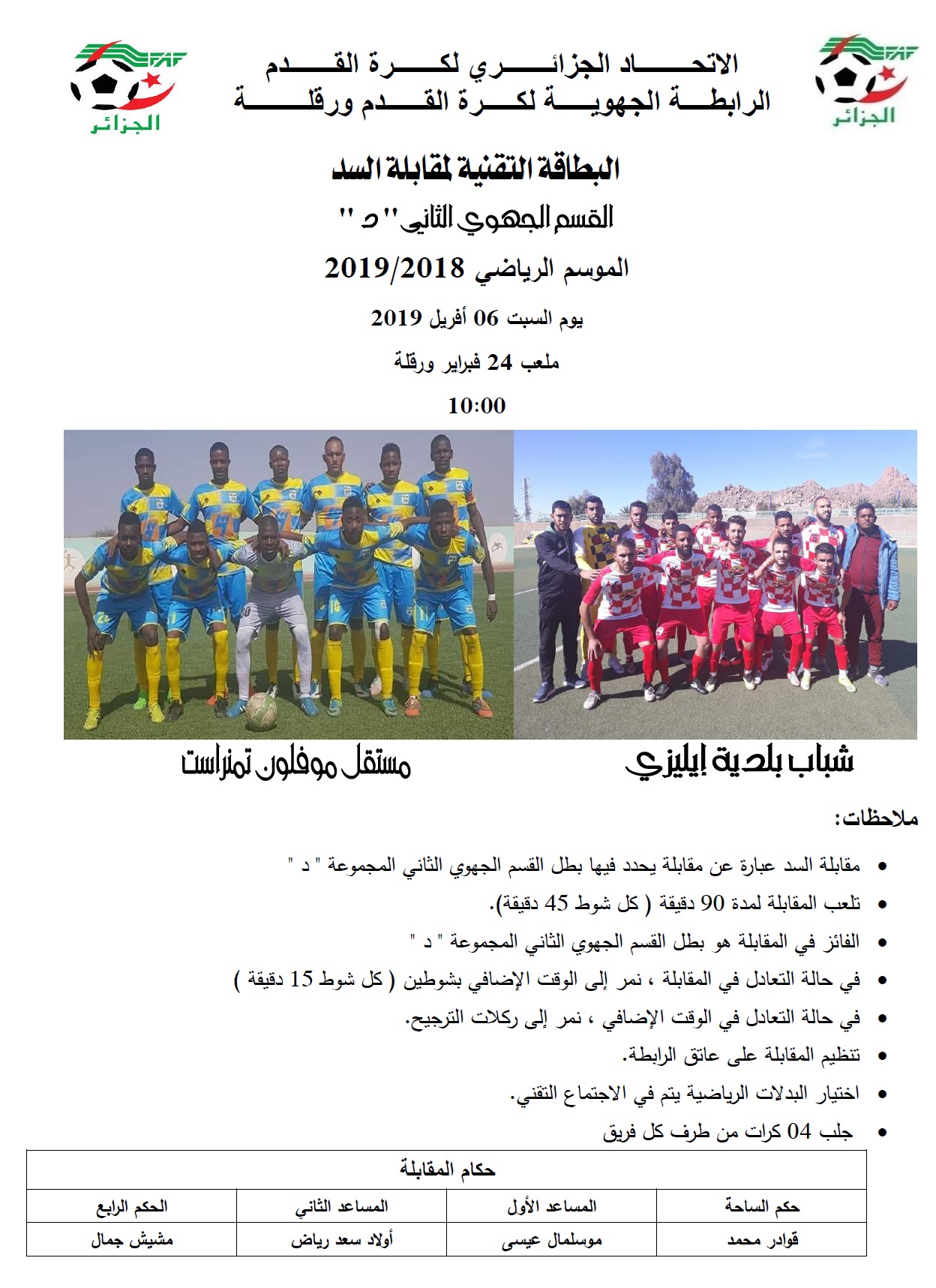 - الطاقم التحكيمي المتكون من السادة : قوادر محمد - موسلمال عيسى - أولاد سعد رضوان - جمال مشيش