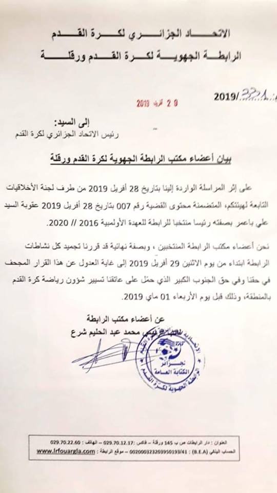 بيان أعضاء مكتب الرابطة الجهوية لكرة القدم ورقلة