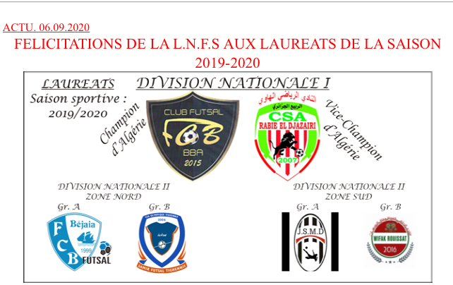 بعد تحديد ابطال القسم الاول و الثاني لبطولة كرة القدم داخل القاعة لموسم 2019/2020 يهنئ رئيس الرابطة الجهوية لكرة القدم للجنوب الشرقي ، اعضاء مكتب الرابطة و لجنة كرة القدم داخل القاعة الفرق المتوجة و الصاعدة للقسم الاول والتوفيق ان شاء الله في قادم المواسم