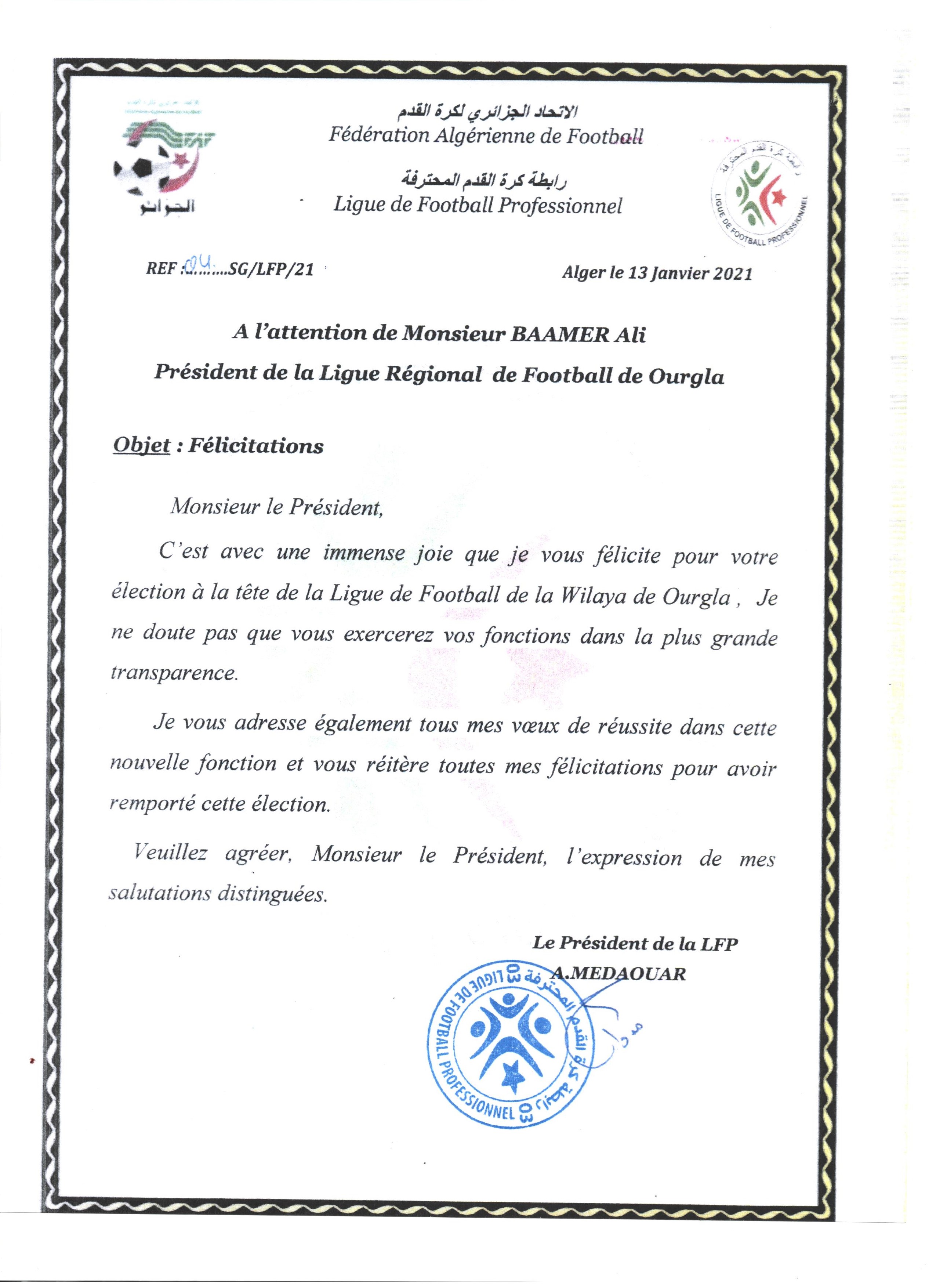 مراسلة الرابطة الوطنية المحترفة لكرة القدم بخصوص إعادة انتخاب السيد علي باعمر