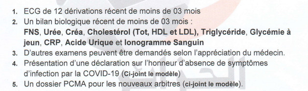 تبعا لمراسلة الاتحاد الجزائري لكرة القدم المتعلقة بالفحص الطبي لحكام ما بين الرابطات - الجدد- ، نعلم جميع الحكام المعنيين أنكم مدعوين لإجراء هاته الفحوصات يوم الخميس 26 أوت 2021 بالمركز الجهوي للطب الرياضي ورقلة بجانب ديوان مؤسسات الشباب على الساعة السابعة صباحا مرفقين بالملف أدناه: