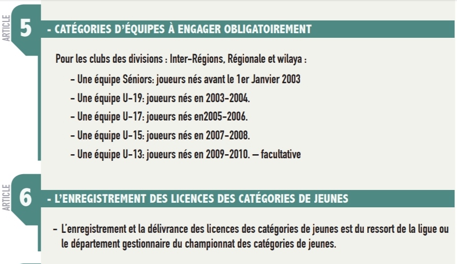 نذكر النوادي الرياضية أنه وطبقا للمادتين 6 و 7 من الإجراءات والتنظيمات المتعلقة بالبطولة الهاوية كل فريق ملزم بالانخراط في الفئات الشبانية أقل من 19، 17 و 15 سنة بصفة إجبارية، وأن الفرق الهاوية فئاتها الشبانية تسير من طرف الرابطة الجهوية التابعة لها إقليميا.
