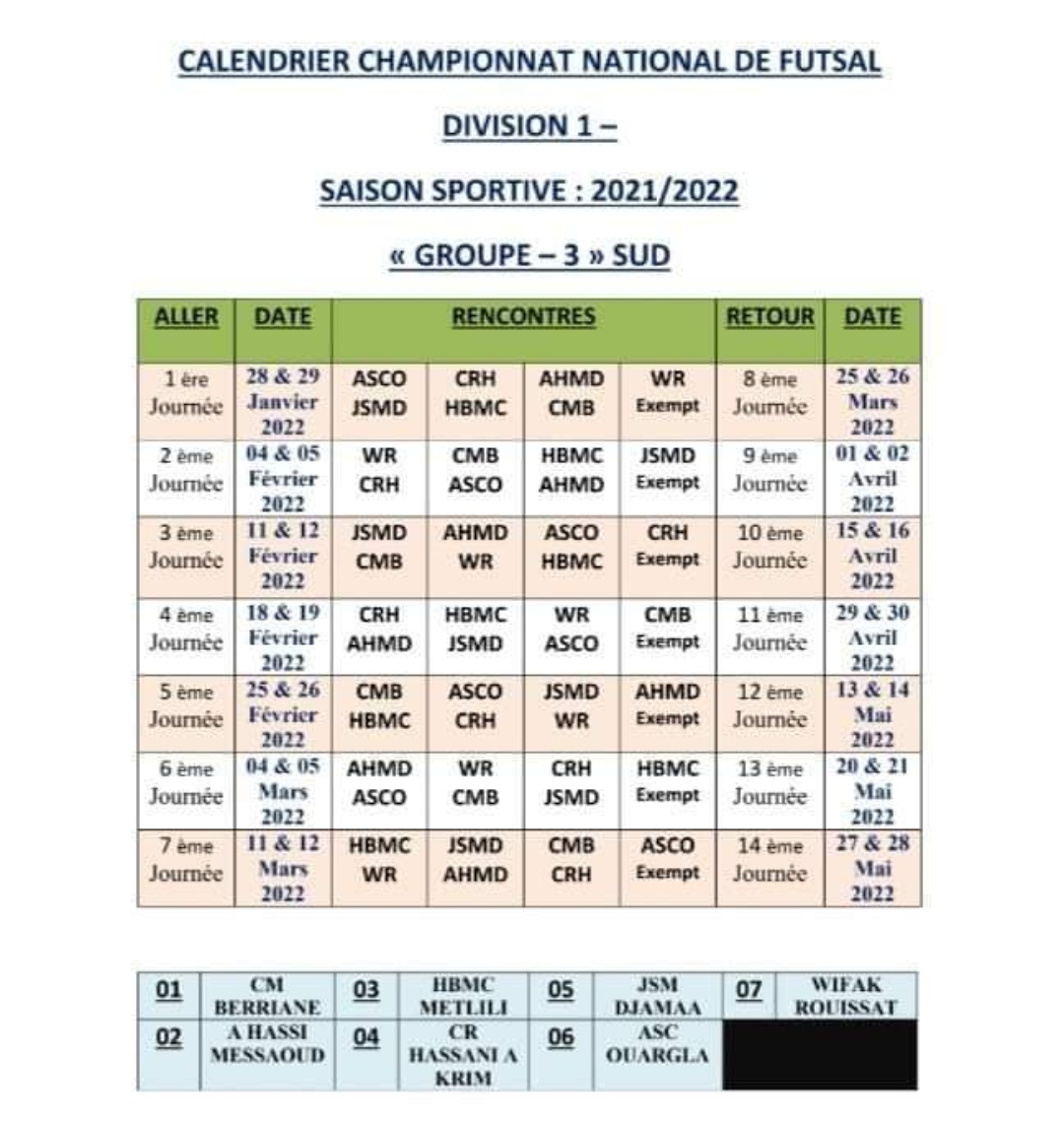 ستنطلق بطولة القسم الوطني الاول لكرة القدم داخل القاعة الاسبوع القادم لافواجها الثلاث حيث سيشهد هذا للموسم استحداث فوج جنوب لاول مرة تحت ادارة القسم الفدرالي لكرة القدم داخل القاعة ،يهنئ السيد رئيس الرابطة الجهوية و جميع اعضائها كل الفرق و يتمنى لهم النجاح و التوفيق في تطوير هذه الرياضة .