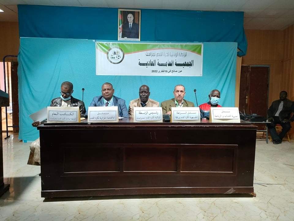 انعقدت اليوم السبت الموافق ل 2022/02/19 و على الساعة 9:00 الجمعية العامة العادية للرابطة الولائية لكرة القدم تمنراست بالولاية الجديدة عين صالح و تحت اشراف المحضر القضائي بحضور ممثلي الاتحاد الجزائري لكرة القدم حيث تمت المصادقة و بالاجماع على التقرير المالى لسنة 2021و التقرير الادبى للموسم الرياضي 2021/2020 و الميزانية التقديرية للسنة 2022.