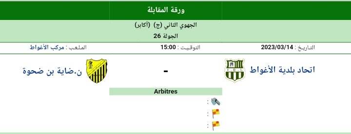 برمجة مقابلات بطولة الجهوي الاول فوج ( أ ، ب ) و الجهوي الثاني ( أ ، ب ،ج ) والتي ستجرى يومي الجمعة و السبت 17، 18 مــــارس لإطلاع على البرمجة اضغط على برمجـــــة الأســــبوع