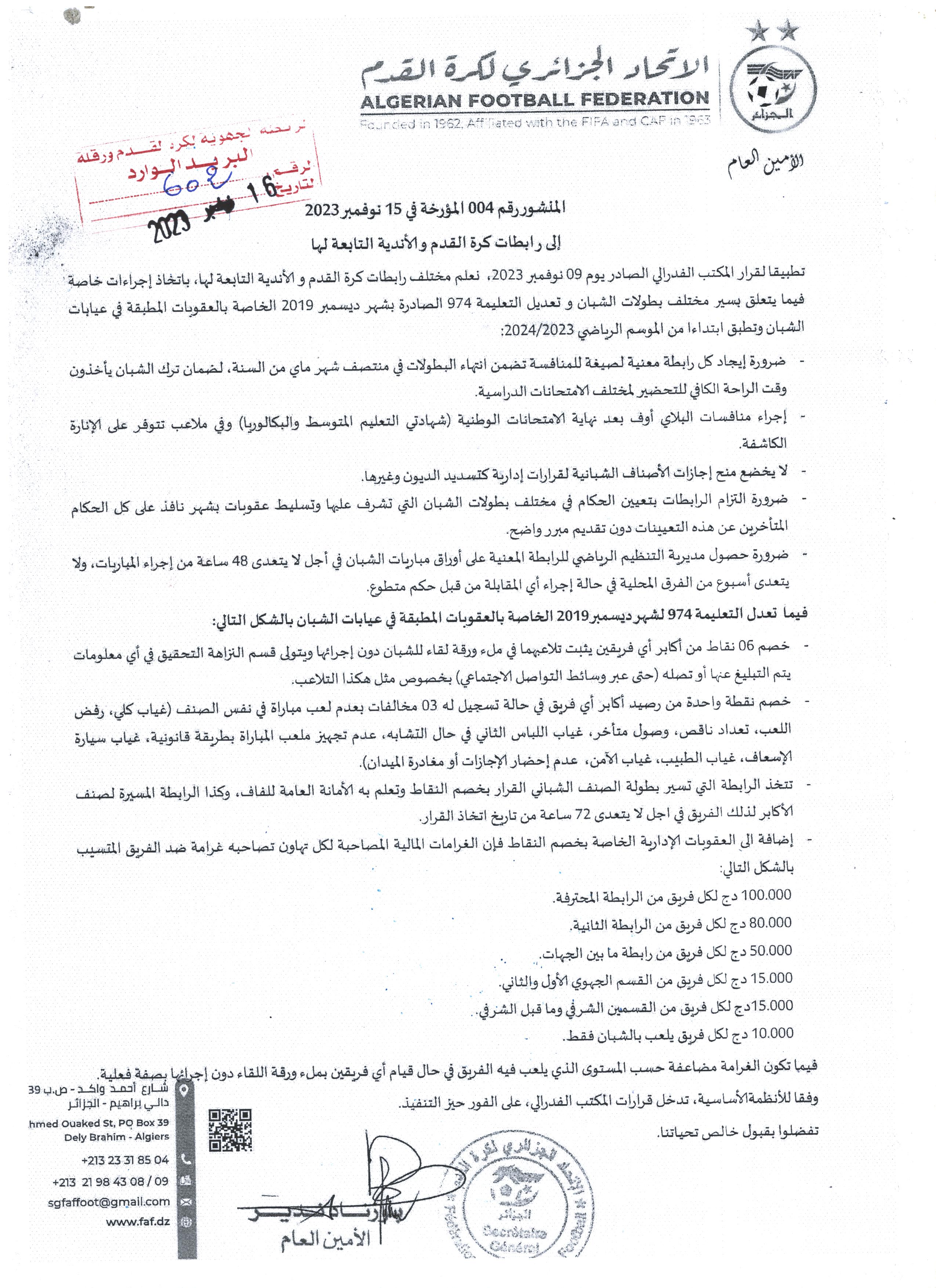 مراسلة الاتحاد الجزائري لكرة القدم بخصوص تعديل التعليمة 974 لشهر ديسمبر 2019 الخاصة بالعقوبات المطبقة في غياب الفئات الشبانية