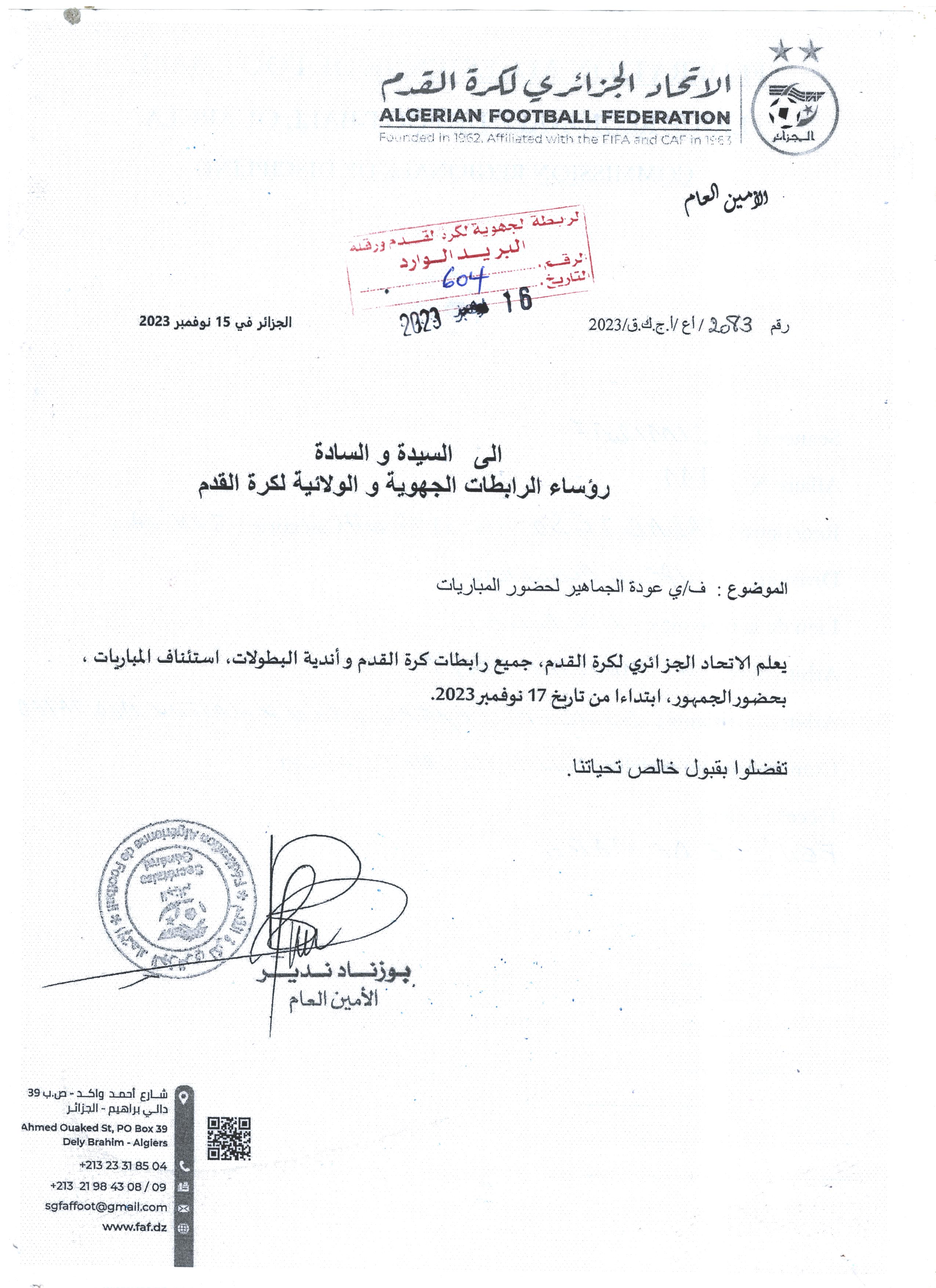 مراسلة الاتحاد الجزائري المتعلقة بعودة الجماهير لمتابعة مقابلات جميع البطولات بداية من يوم الجمعة 17 نوفمبر 2023
