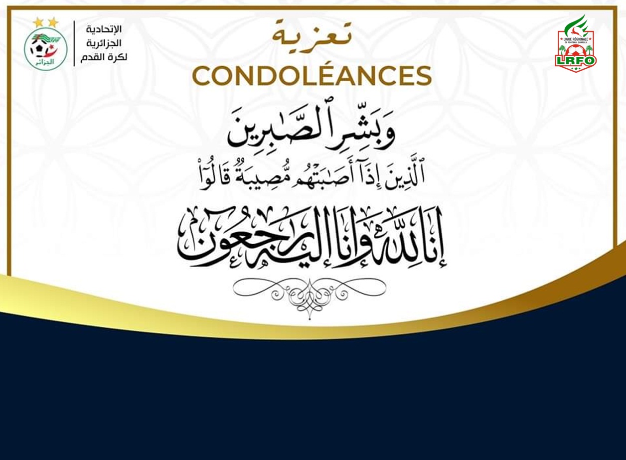 وبهذا المصاب الجلل، يتقدم رئيس الرابطة الجهوية لكرة القدم ورقلة وأعضاء مكتبه إلى عائلة الفقيد بخالص التعازي وأسمى عبارات المواساة، سائلين المولى عز وجل، أن يتغمد فقيدهم بواسع رحمته، ويسكنه فسيح جناته ويلهم أهله وذويه جميل الصبر و السلوان