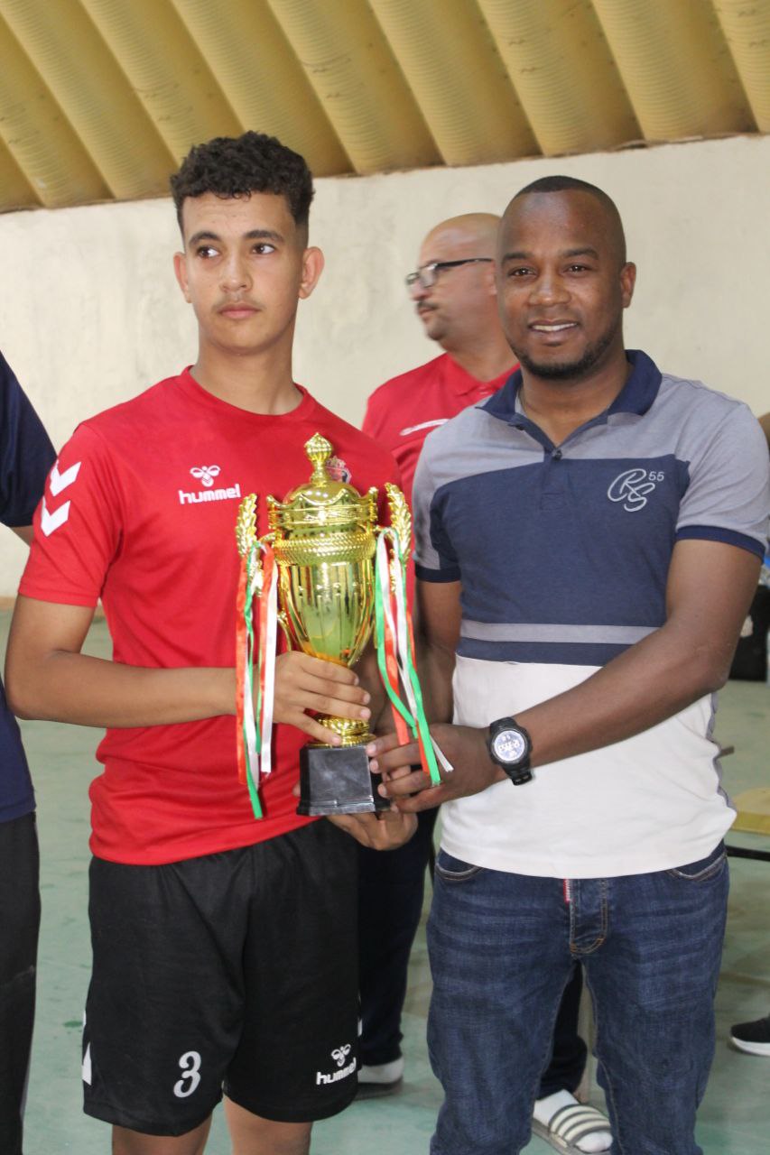 و تم تسليم كأس البطولة من طرف السيد إسكندر عشي نائب الرئيس المكلف بكرة القدم داخل القاعة بحضور الامين العام للرابطة و طبيب الرابطة وأعضاء لجنة كرة القدم داخل القاعة