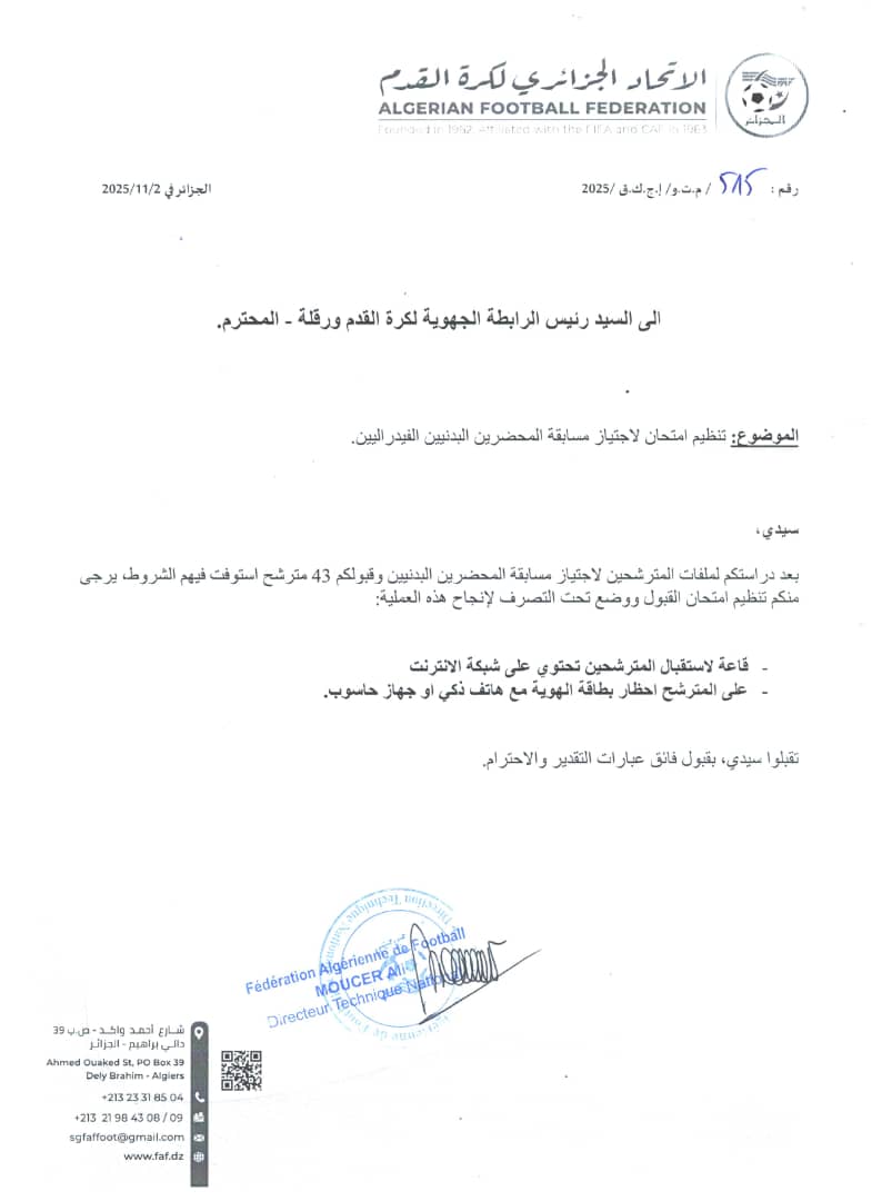 في اطار التنظيم اللوجستيكي لامتحان الترشح في مسابقة المحضرين البدنيين الفيدراليين الخاصة بمنطقة الجنوب الشرقي تعلم الرابطة الجهوية لكرة القدم ورقلة الى المشاركين المدونة أسمائهم في القائمة ادناه انه حدد يوم الخميس 06 نوفمبر 2025 بورقلة ابتداء من الساعة 09 صباحا موعد اجتياز الامتحان ، مرفوقين ببطاقة الهوية وهاتف ذكي او جهاز حاسوب